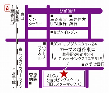東武スカイツリーラインで越谷駅東口から徒歩3分。ALCoショッピングスクエア内、エスカレーター(エレベーター)で地下1階に降りる。越谷カルチャーセンターさん隣。