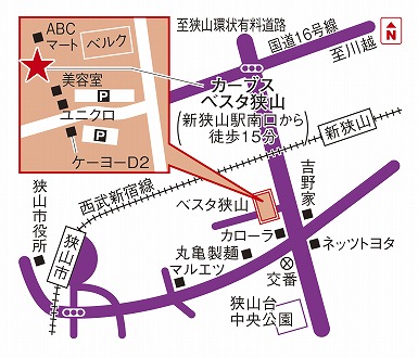 ショッピングセンター「ベスタ狭山」内にあります。ユニクロさん側にあるマツキヨさんと、美容院さんの間を入り、ABCマートさんの左奥になります。