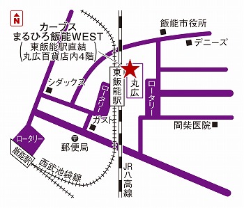 JR八高線・西武秩父線の東飯能駅改札出て左、駅直結丸広エレベーター4階降りてすぐ右手、メンズ・カーブスの隣