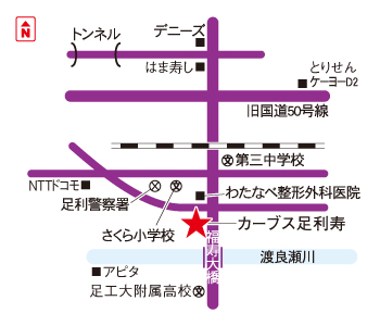 福寿大橋を北に向かって降りてすぐの十字路の左側、わたなべ整形さんの反対側にあります。