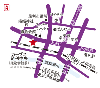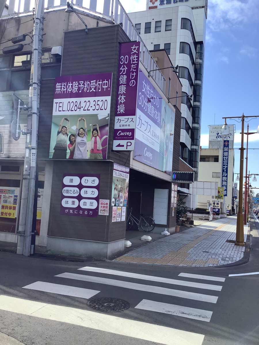 旧50号線沿いです。織物会館さんの向かい、お隣東側にマンションがあり、2階建ての1階がカーブス足利中央です。