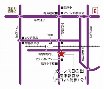 東武南宇都宮駅南側に出て徒歩3分。セブンイレブンさんの北側、3Fコンクリートビルの2Fです。