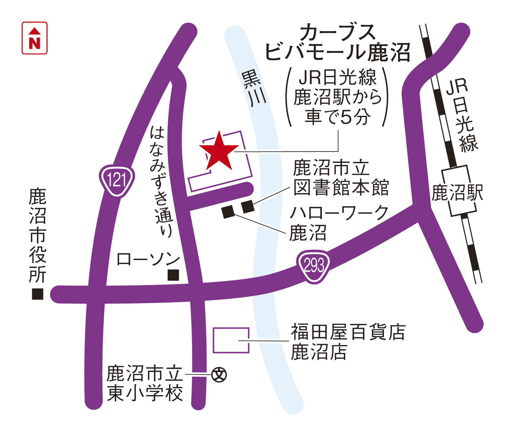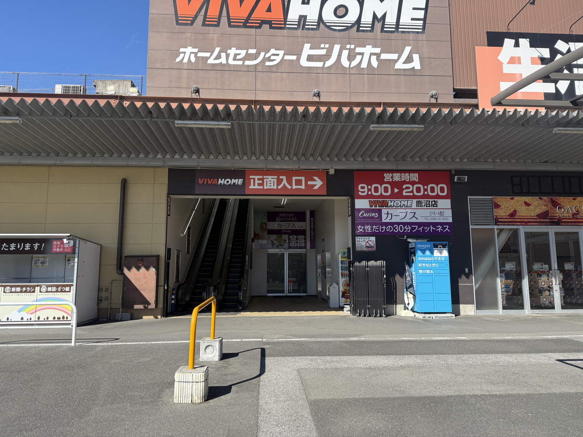 JR日光線鹿沼駅改札を出てそのまま直進し、坂を下って道なりにまっすぐ、右側にローソンさんが見えたらその信号を右折、鹿沼市民情報センターの信号を右折、すぐ左側にあるビバモールのヨークベニマルさんとビバホームさんの間にあるエスカレーターの奥がカーブスビバモール鹿沼です。
