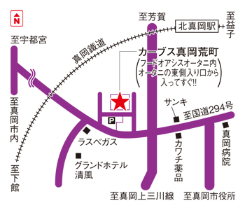 真岡鐵道真岡線の北真岡駅を出て西に進み、水橋街道/県道156号を通り過ぎ萩田稲荷神社のあるT字路を左折、300mほど直進し、右側にあるフードオアシスオータニ荒町店さんの店内東側がカーブス真岡荒町です。フードオアシスオータニ荒町店さんの駐車場が利用可能です。