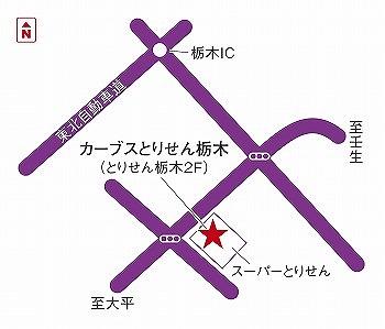 とりせん栃木店ダイソーさん側入り口より右手に進み、エスカレーターを利用し2階、降りたら左手に進み突き当たりを右手でカーブスになります。
