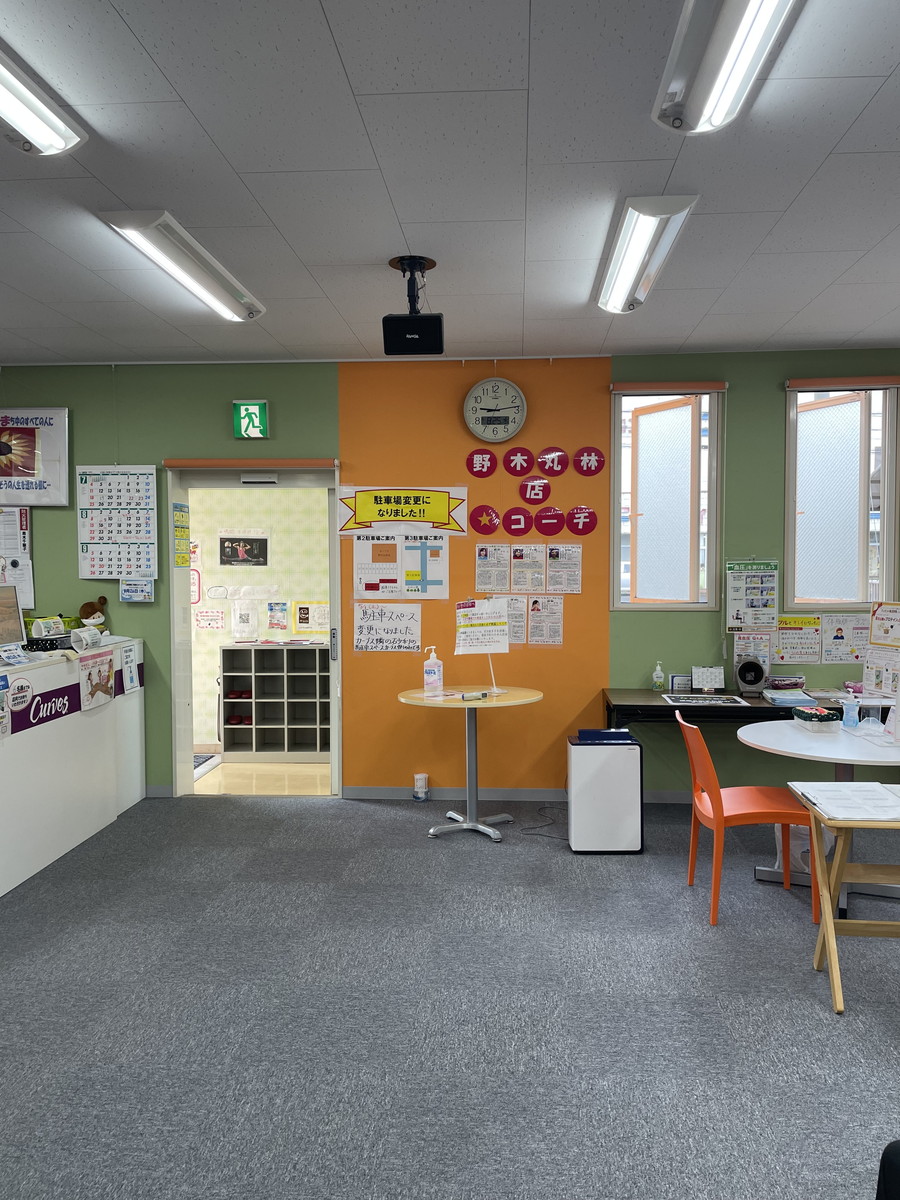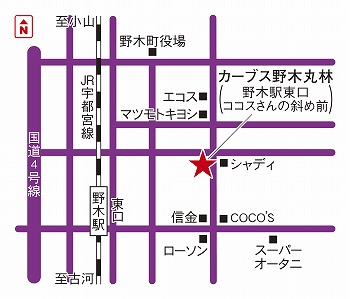 JR宇都宮線/JR湘南新宿ライン 野木駅東口を出て直進し、ファミリーレストランcoco’sさんの角を左に曲がります。約200m進んだ左側の建物がカーブス野木丸林店です。