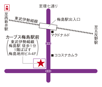 梅島駅を出て左へ直進するとココスナカムラさん(スーパー)があります。ココスナカムラさんから道路を挟んだ向かい側にドラッグパパスさんがあります。そのドラッグパパスさんが入っているビルの4階にカーブスがあります!