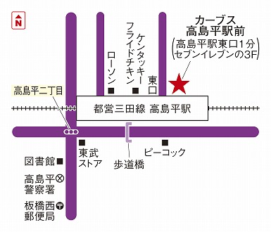 都営三田線「高島平」駅東口北側(団地の反対側) 駅の階段を下りて目の前、セブン-イレブンさんのビル3階です♪