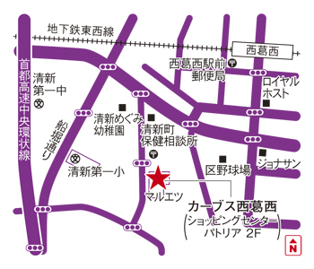 都営バス清新町1丁目バス停から徒歩1分。ショッピングセンターパトリア2階。