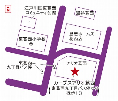 都営バス21系統 東葛西9丁目下車徒歩1分。アリオ葛西2階、東エレベーター降りてすぐ右手です。