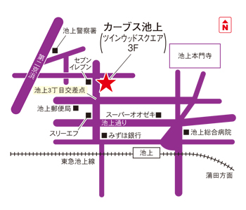 東急池上線池上駅から徒歩5分。駅を出て左側の通りを直進、マイバスケットさんまで来ましたら右に曲がり横断歩道を2つ直進し焼肉安安さん隣のビル3階です。
