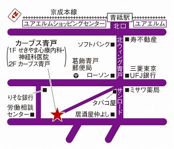 青砥駅改札を出て右、階段をおり右に曲がり直進。2つ目の信号手前、居酒屋なかよしさんの角を右に曲がり直進、右手に見える桜色の中川ビル2階です。