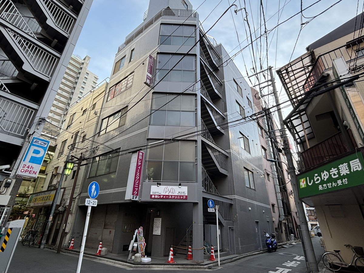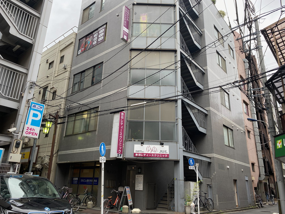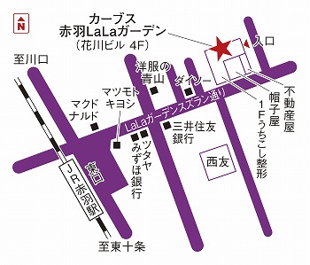 JR赤羽駅東口から徒歩6分、LaLaガーデン(赤羽スズラン通り)にある三愛ハウスさんと王様のお菓子ランドさんの間を曲がってすぐ左手、赤羽レディースクリニックさんなどが入っている花川ビルのエレベーターで4階