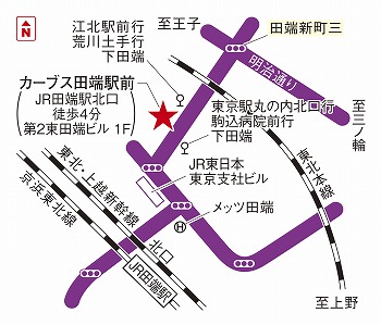 JR尾久駅からお越しの方 改札を出て田端方面(南東方向)へ進みます。田端新町三丁目交差点を目指し、直進します。田端新町三丁目交差点を田端駅方面へ曲がり線路を超えた先の右手にあるマンションの1階です。