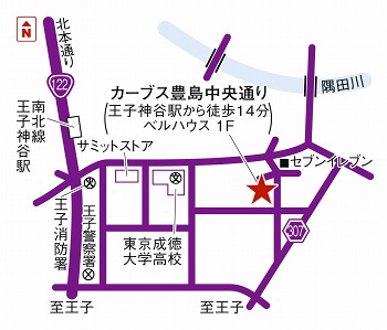 豊島中央通り商店街を入って魚濱さんの真向かい、紫の看板が目印(^^)お店すぐ横に駐輪場がありますので自転車でもお越し頂きます!豊島4丁目バス停から徒歩で約3分。成徳大学高校、紀州神社の近くです。 -