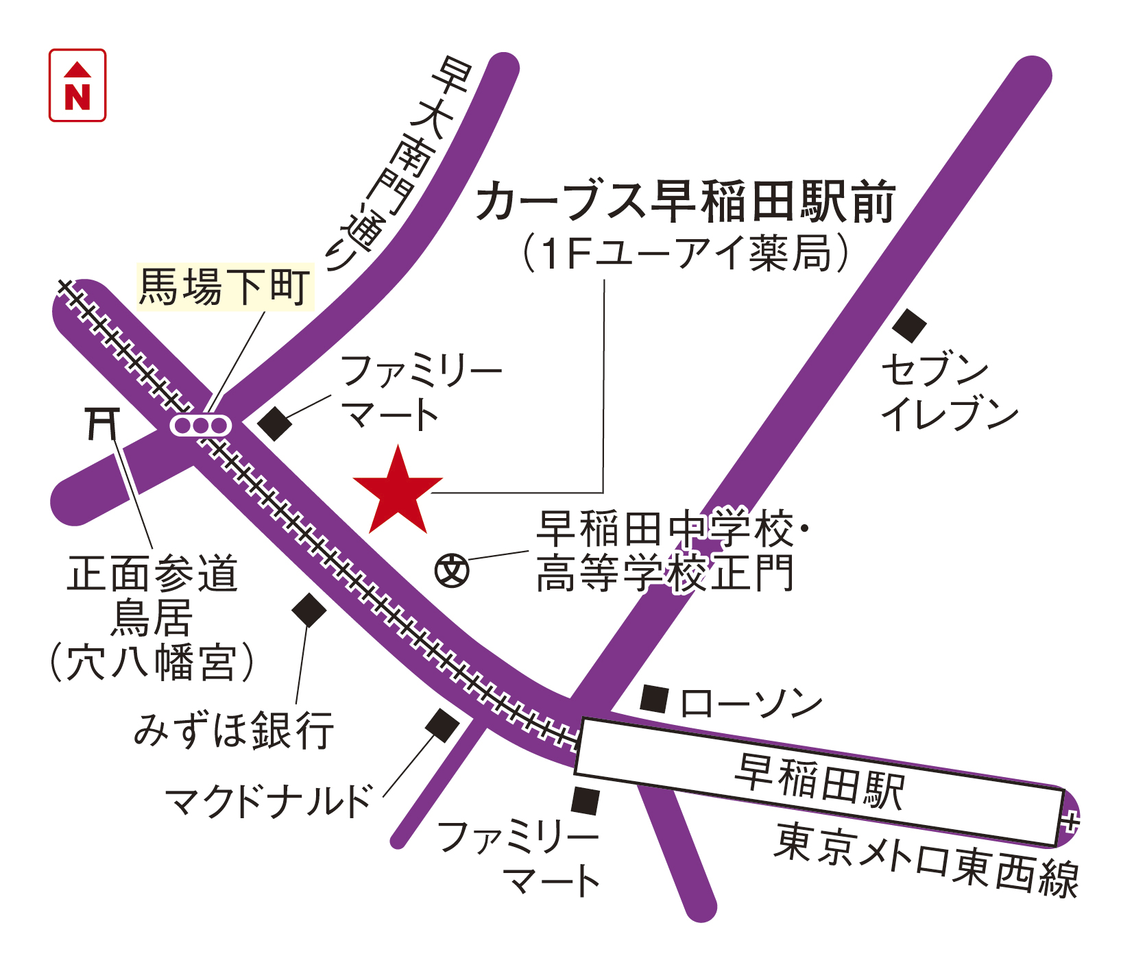 東西線早稲田駅前3b出口を出て右へ、早稲田高校・中学校さんの正門のお隣のビル。一階がユーアイ薬局さんのビルの2階です。