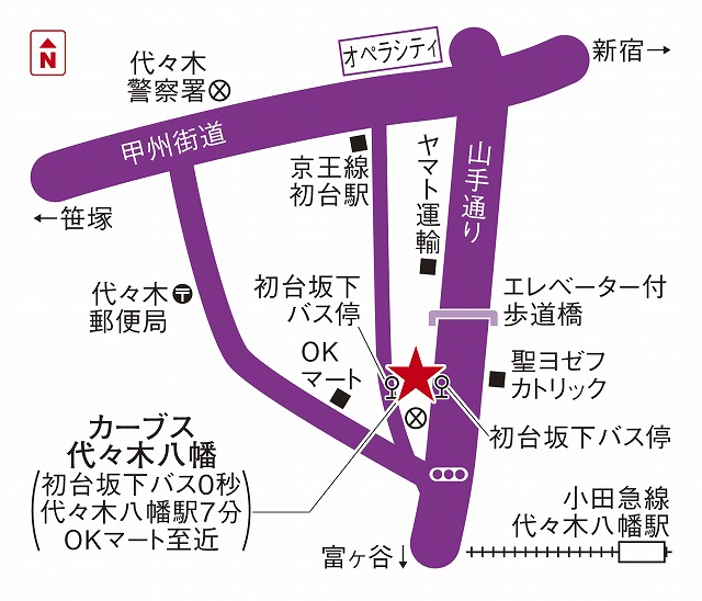 山手通り沿い、(京王線)初台駅南口 徒歩約5分(小田急線)代々木八幡駅 徒歩7〜9分、初台坂下バス停 目の前 徒歩0分、隣にコインパーキングあり