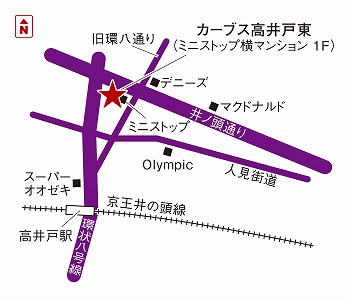 関東バス/高井戸駅荻窪方面行きのバスに乗り井の頭通り停留所徒歩1分。バスを降りたら右へ直進し、ミニストップさんの角を左に曲がったら隣にあるドムス高井戸マンションの1階にカーブス高井戸東店があります。