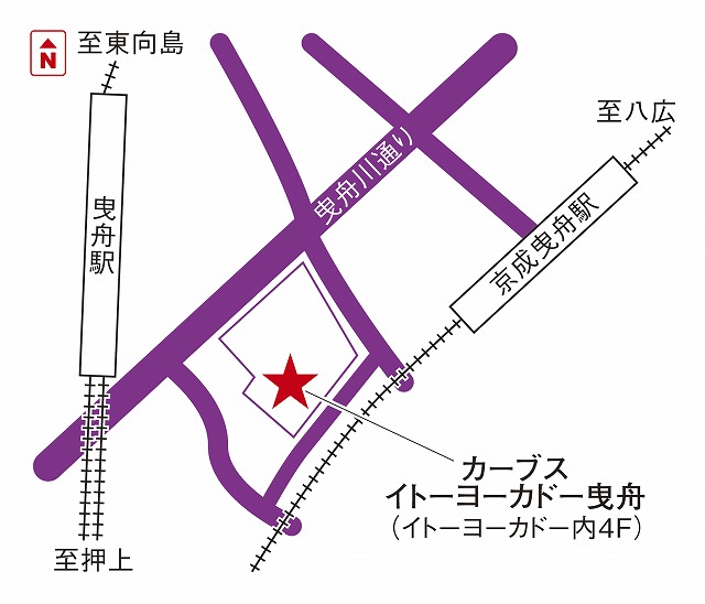 東武曳舟駅にて下車。東口を出て目の前の横断歩道を渡り、たから通り側口よりイトーヨーカドーに入店。エスカレーターで4階まで上がり、右手に曲がる。namcoさんの隣。