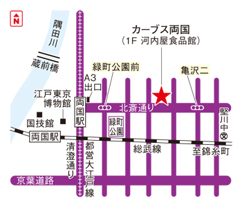 都営大江戸線 両国駅(A2、A3出口)から徒歩5分。北斎通り沿い河内屋食品館の2階。