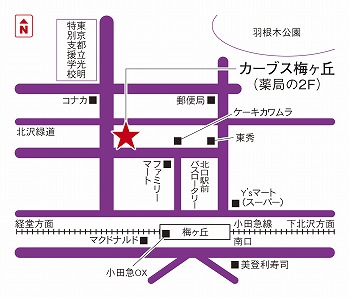 小田急線梅ヶ丘駅北口より徒歩1分 交差点角の長島ビル2階。 駅からすぐなので買い物帰りに!