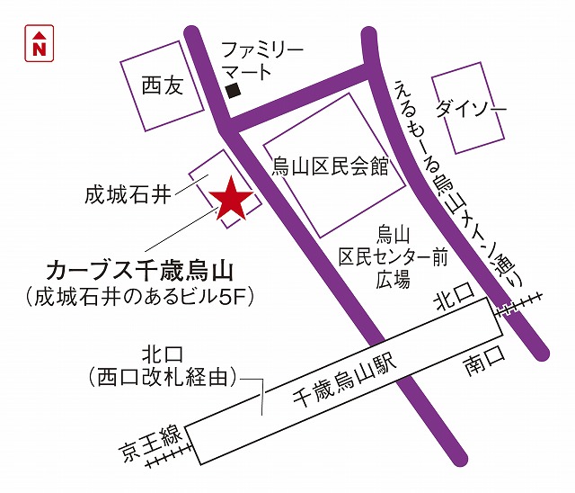 京王線千歳烏山駅北口を左へ直進し、松軒中華食堂さんの前の通りを右に曲がり成城石井さんのある烏山第2倉林ビル5階