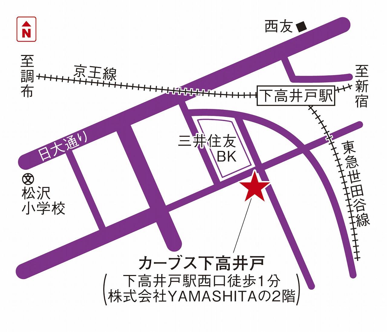 京王線下高井戸駅の改札を出て直進し、西口の階段を降りて、三井住友銀行を左手に歩き1つめの角を左に曲がります。
