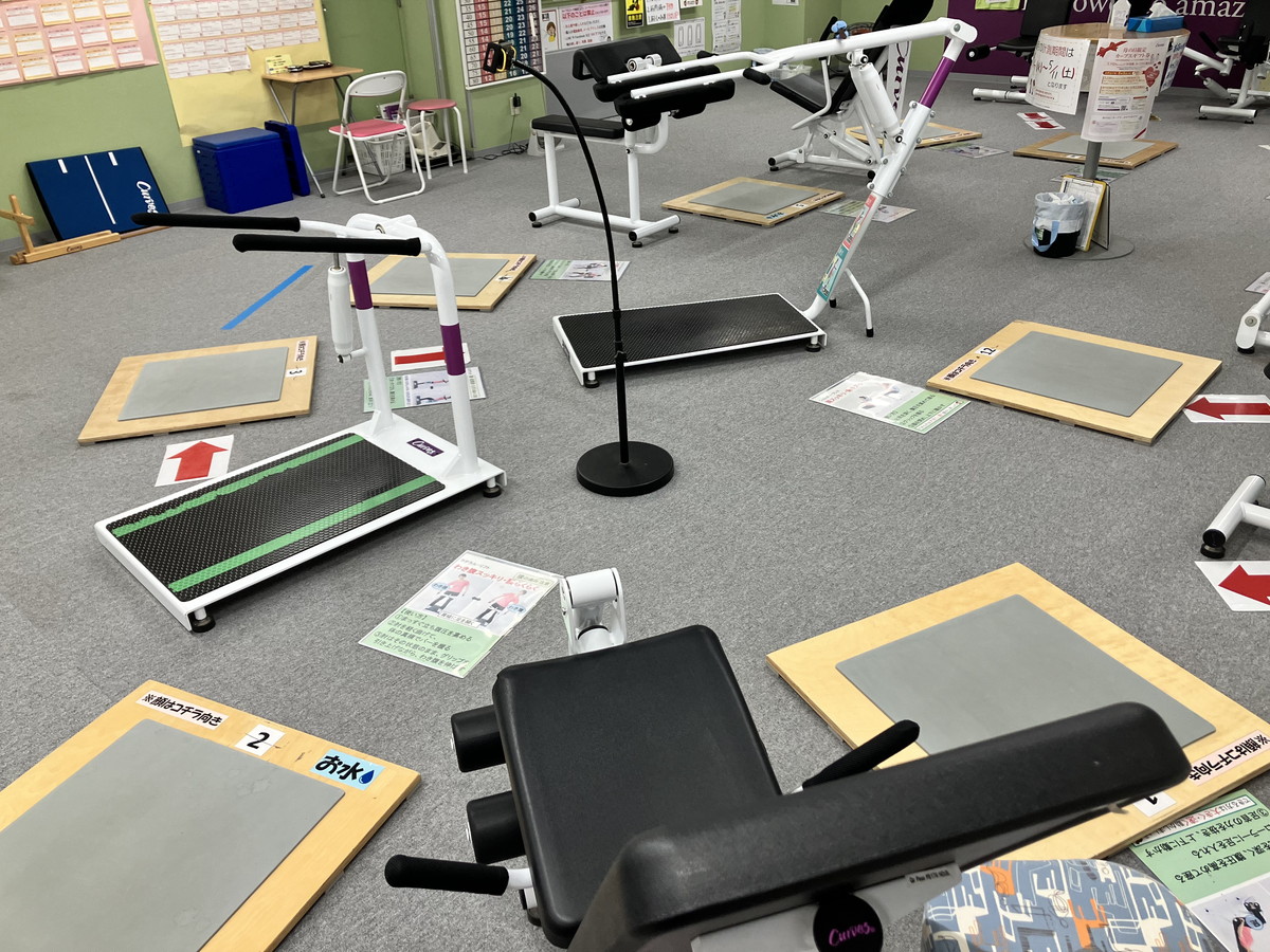 店内は12台のマシンが並んでおり、全身の筋トレができる仕組みになっております!明るい店内なので過ごしやすいです! -