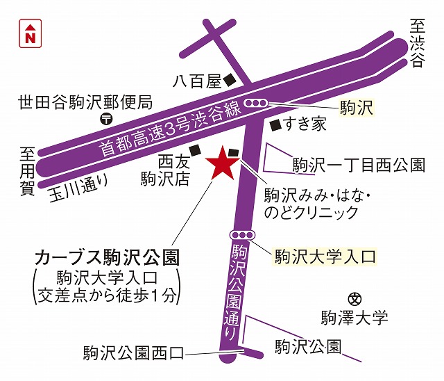 東急田園都市線 駒沢大学駅 駒沢公園口より徒歩7分。駒沢公園口を出て左へ直進し、国道246号線 駒沢交差点すき家さんの信号を渡り、駒沢公園方面へすぐ左折。駒沢みみ・はな・のどクリニックさんのお隣1階がカーブス駒沢公園店です。