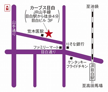 JR山手線目白駅出て左に直進します。ファミリーマートさんがある目白三丁目交差点を右折し、すぐ左折します。荒木医院さんのお隣さん、1階が目白ミサクリニックさんの3階がカーブスです。