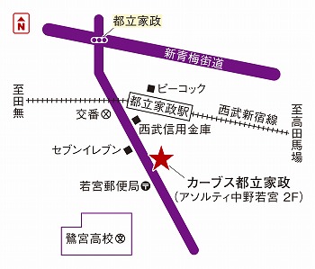 西武新宿線 都立家政駅南口を出て、左手商店街を直進 徒歩3分 や台ずし 都立家政駅南口町店さんの2Fです。※店前に駐輪場はありません。お近くの駐輪場をご利用下さい。