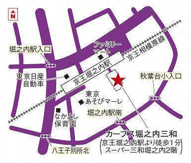 京王相模原線京王堀之内駅改札口を出て直進します。マツモトキヨシさんを右折し、スーパー三和堀之内店さんの入口を入り、エスカレーターで2階へ上がる。ダイソーさんを左側に突き当たりまで進み右折しNICE NAILさんのお隣がカーブス堀之内三和店です。