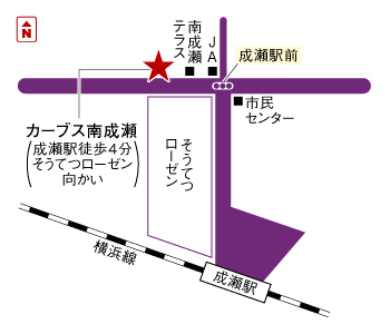 JR横浜線成瀬駅から徒歩4分。北口を出て左折、そうてつローゼンさんを左手にして直進します。そうてつローゼンさんを過ぎ、最初の横断歩道を渡ったら左折して、右手にある南成瀬テラスさんのお隣のビル(ベストンビル)の1階がカーブス南成瀬です。
