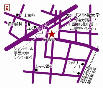 駅を出て西口商店街を直進し、東京油組総本店〈油そば〉さんを右折、バス通り沿い市川学芸大ビル2Fです。正面の階段よりお気軽にお立ち寄りください。