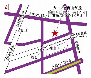 自由が丘駅北口徒歩1分!北口を出て右折。真っ直ぐ行くと踏切が見えます!踏切を渡らず線路沿いを歩き、左手にアンセーニュダングルという喫茶店が見えたら、同じ建物です。階段を使って3階までお越しください! -