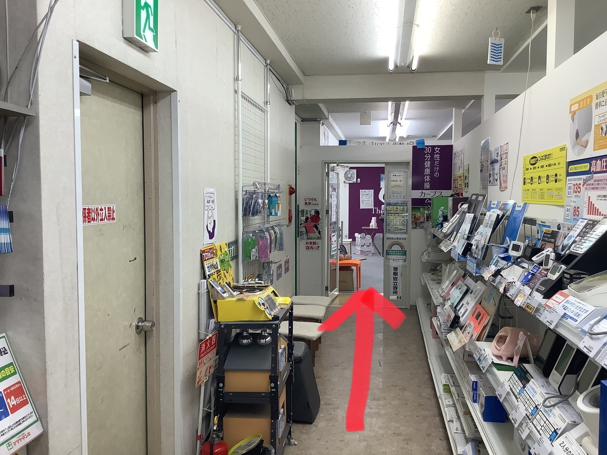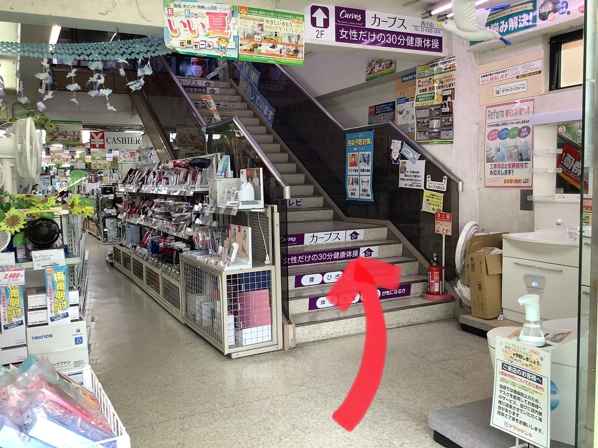 階段を登ったら店の奥に向かいます。レジ前を右に進むとカーブスの入口です。