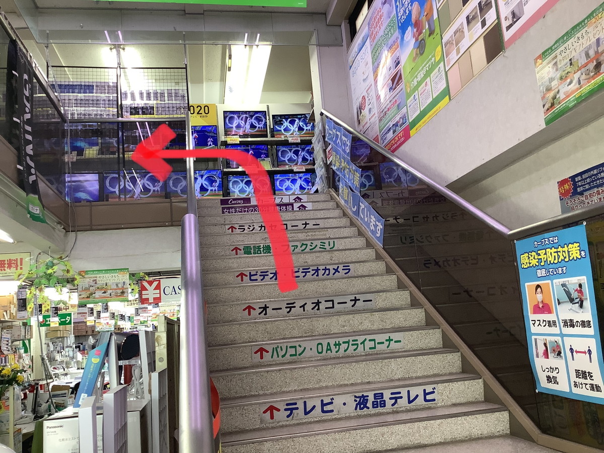 マツヤデンキさんの店内に入ったら、階段もしくは奥のエレベーターで2階まで上がります。