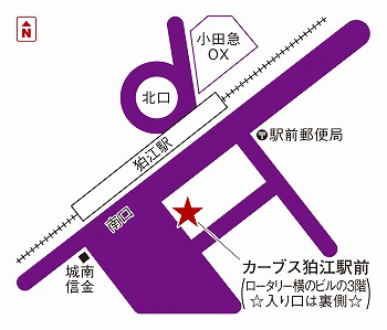 小田急線狛江駅から徒歩1分。南口から出て右折し、100mほど直進したところで、左手に見える肉汁餃子ダンダダンさん側へ渡ります。肉汁餃子ダンダダンさんと同じビル(狛江ファーストビル)の3階がカーブス狛江駅前です。カーブス狛江駅前の入り口は、ビルの裏手へ回り、エレベーターで3階です。