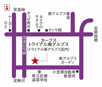 スーパーセンタートライアル南アルプス店さん西側入り口から、エスカレーターで地上階に上がり、すぐ左側。セリアさんの斜め隣がカーブスです。