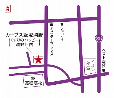 西鉄バス嘉穂高校入口で下車。徒歩3分くすりのハッピー潤野店敷地内にあります。ハッピーの左隣カーブスの入口あります。駐車場はハッピーの敷地内ご利用ください。