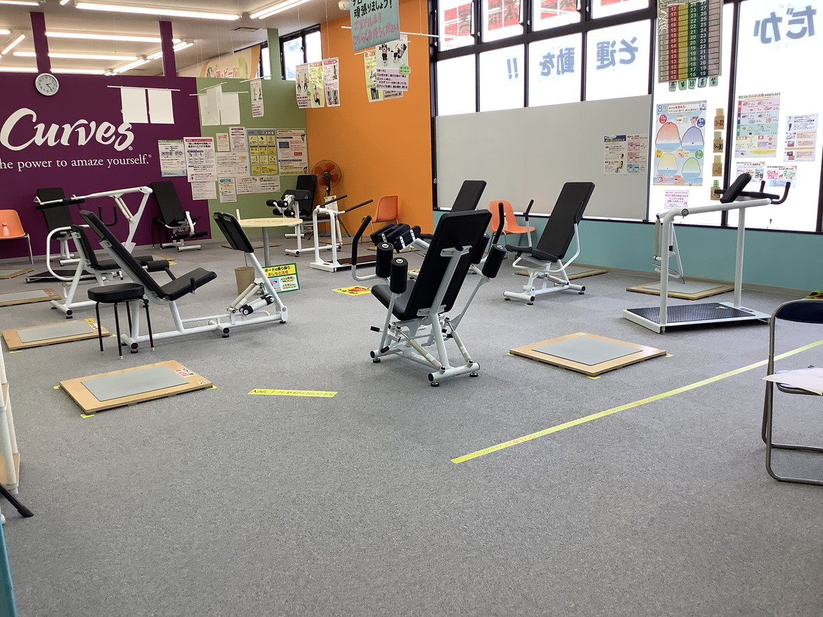 三中交差点から菜の花大橋に向かい徒歩3分。直方第三中学校横ファミリーマート直方菜の花大橋西店さんからサンリブ直方店さんに向かって直進。右手にハッピー薬局があり、店内にカーブスあります。
