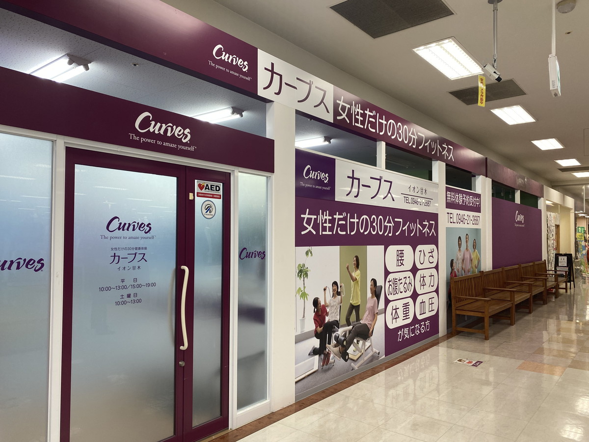 県道8号線の東田東の交差点、車で1分のイオン。正面入り口からエスカレーターで2階で降り右に進むと突き当たりにゲームセンターがあります。突き当たりのゲームセンターを右に曲がるとカーブスイオン甘木店があります。