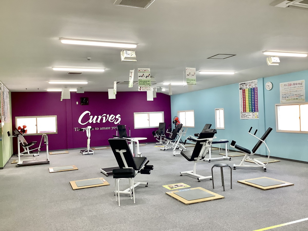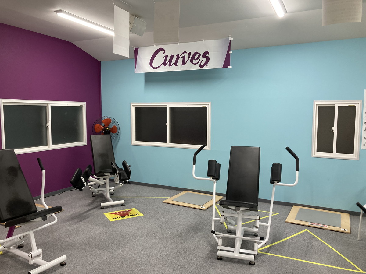 ルミエール志免店さんの道路向い側にある下志免バス停横に店舗入り口があり、階段登ってすぐカーブスです。