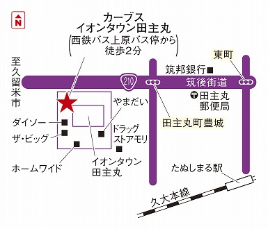 西鉄バス→上原停留所徒歩5分 車→国道210号線、田主丸町豊城の信号付近イオンタウン田主丸内ハーバーショップSIGNALさん隣