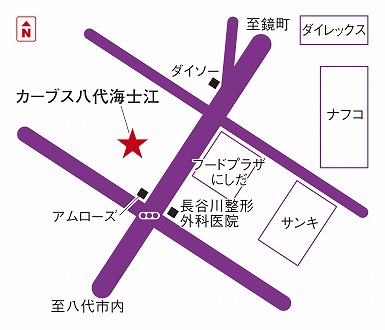 八代ICから臨港線を八代港方面へ、OFUKURO酒場タンポポさんが見えたら右折し、県道14号線に入り鏡町方面へ5分。リサイクルショップセカンドストリートさんのお隣です。
