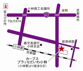 JR吉都線小林駅から徒歩約10分。前原整形外科病院隣。ダイレックスが入ってる建物の2Fにあります。