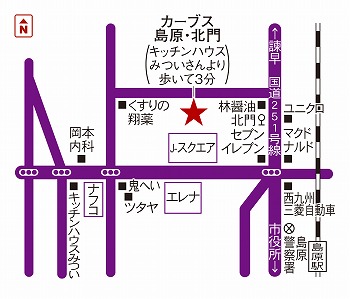 国道251号線、北門3丁目交差点をエレナさん方面に上り、福まん家さんの交差点を右折し車で1分。