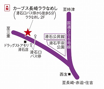 長崎バスで滑石口バス停にて降車し、徒歩5分、生協ララコープなめし2階になります。