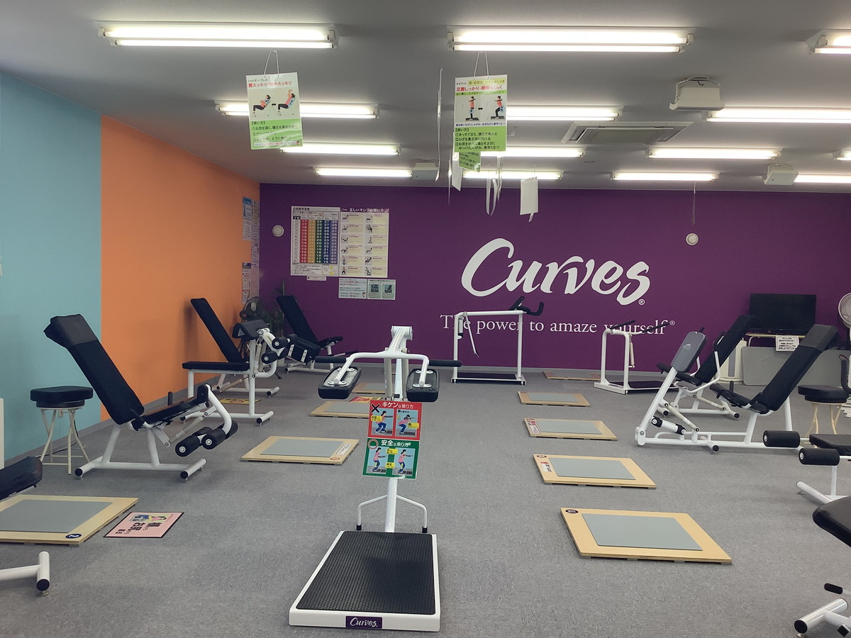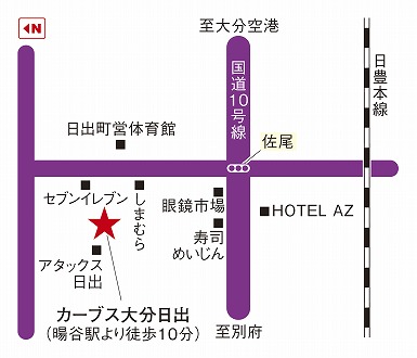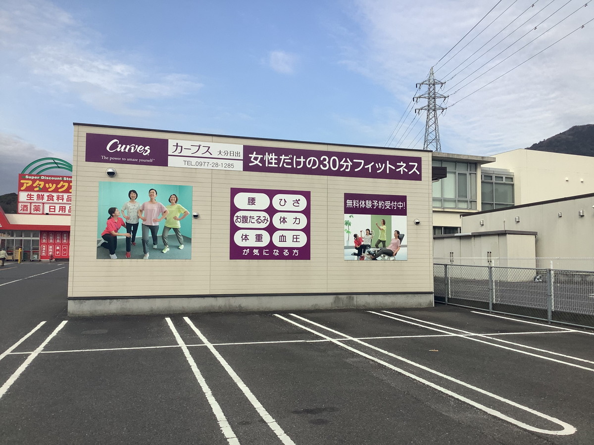 佐尾交差点を眼鏡市場日出店さんの方面へ曲がり、しまむらさんをこえて、アタックス日出店さんの敷地内にカーブスがあります