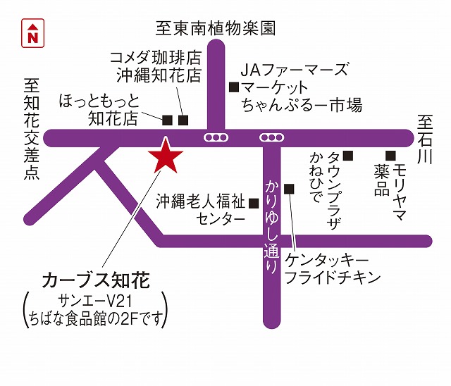 国道329号線沿い、サンエー食品館2階。高速道路沖縄北ICから南向け約1,5キロ。